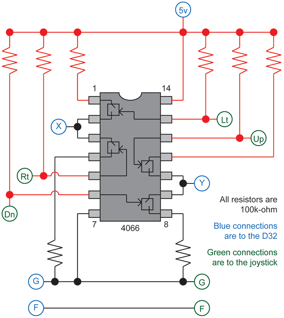 The achieve this in a compact form a 4066 IC is used. This contains the required four switches (two for each axis). A resistor goes before the positive input to the two switches and after the ground output. The Dragon’s pin is connected between the two switches. Additional resistors are required for the inputs to the switches. See the schematic for details.